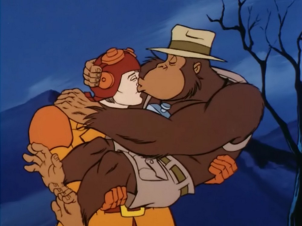 Wenn der Gorilla dem Chaoten panisch in die Arme springt, hilft nur eins, um sich aus der Affaire zu ziehen. Tracy versucht es mit einem verlegenen Kuß. Die Liebe hält jedoch nicht lang, bis sich der Affe schlicht auf dem Boden wiederfindet. ^^
