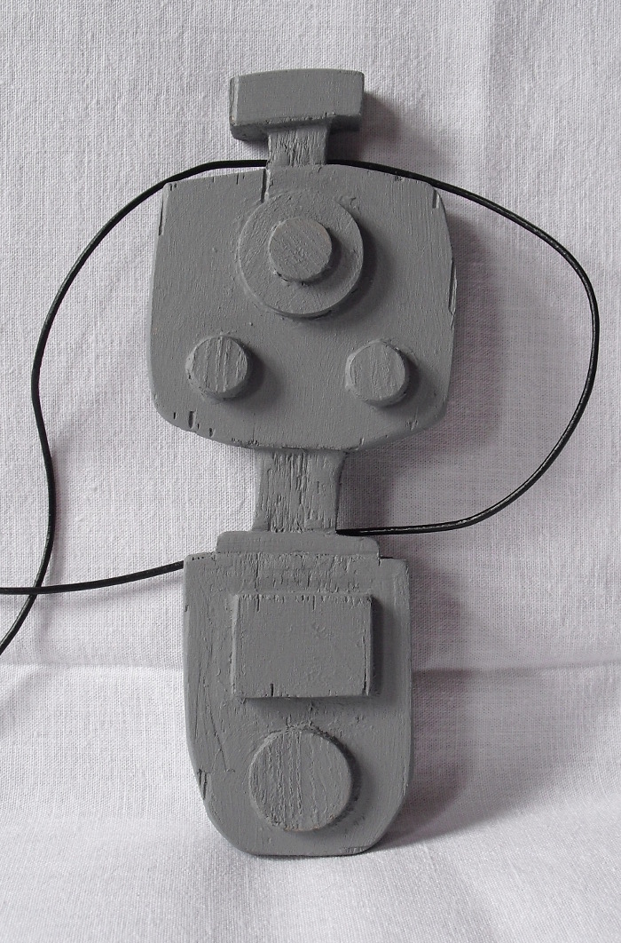 Etwas frustriert begann der Überlegungsprozeß also von vorne. Doch wie sollte ich - vor allem auf die kurze Zeit bis zur nächsten geplanten Fotosession nur knappe zwei Wochen später - eine neue Idee aus dem Hut zaubern? Als ich schon in Erwägung zog, auch das Device über unsere LARP-Waffen-Firma fertigen zu lassen (was ich nie rechtzeitig hätte realisieren können), kam mir plötzlich der rettende Gedanke! (Warum kommt man auf die einfachsten Sachen eigentlich immer erst zum Schluß?) Warum macht man es nicht aus Holz? Eine Tischlerei habe ich nur ein paar Minuten entfernt, – also meine Skizzen und Vorlagen eingepackt, und jetzt kam mir meine Schaumstoffversion auch gut zu Paß, denn die konnte die Tischlerei gut als Muster verwenden! Die erste Version aus Holz (rechts) ist eine Praktikantenversion und kostete mich deswegen nicht einmal etwas. Sieht doch klasse aus! Eine zweite, genauere Version ist gerade in Arbeit. Bis dahin tut diese Variante ihren Dienst, und die Acrylfarbe, die ich eigentlich für das Fimo besorgt hatte, kam auch noch zum Einsatz.