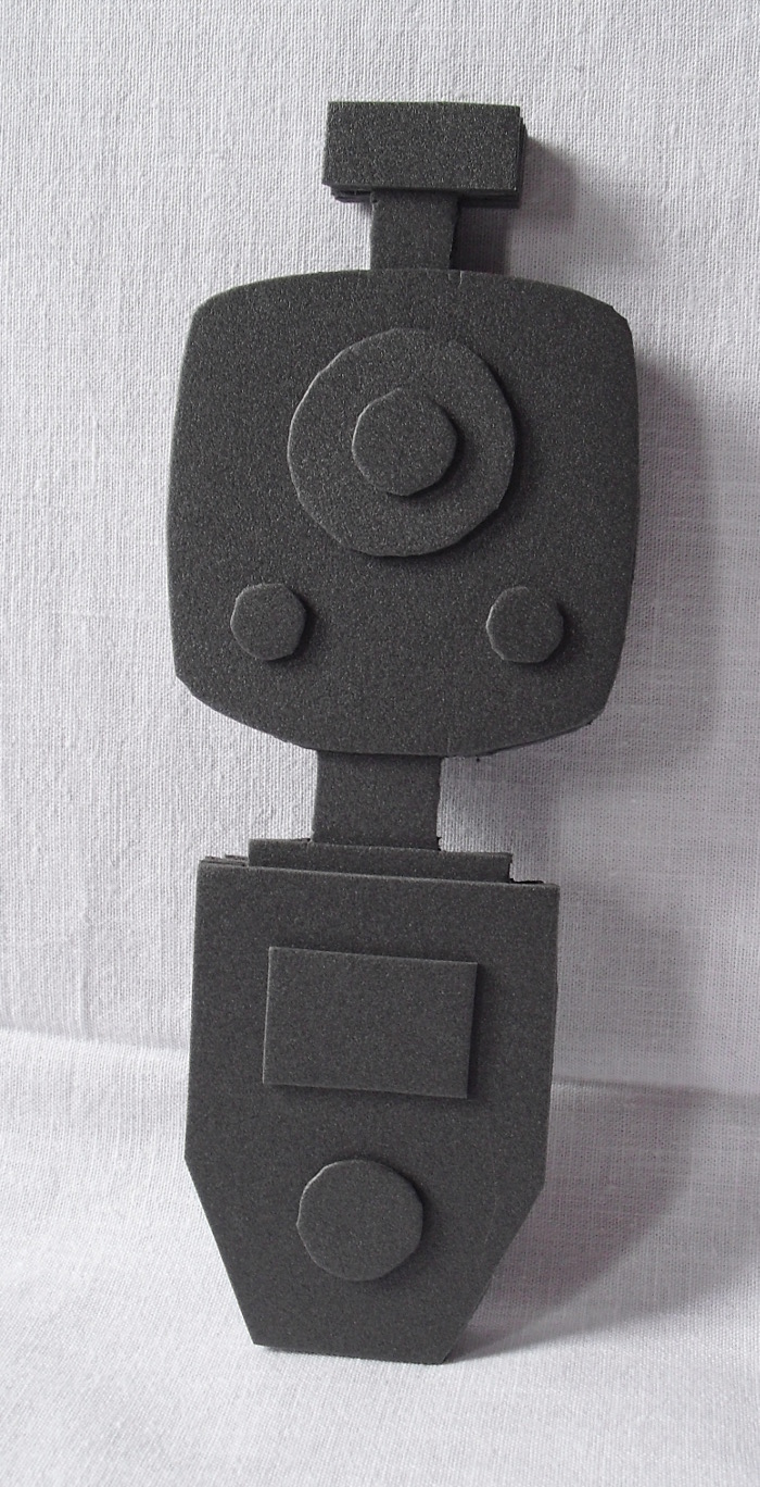 Das Multifunktionsgerät: Kommunikation, Waffen, Hubrotor… Eddies Device ist unabkömmlich! Doch wie am besten nachbauen? Der erste Gedanke, der sich anbot, war Modelliermasse. Meine ersten Versuche mit Rico Superfluffy scheiterten jedoch. Zwar konnte ich die Farbe gut mischen und das Material ließ sich auch gut verarbeiten, doch es war so elastisch, daß ich es nicht in eine glatte Form bekam. Also doch umgeswitcht auf Fimo! Zusammen mit einem Metallgitter zur Stabilisierung ließ es sich nahezu perfekt verarbeiten, und sogar, wie auch bei dem Superfluffy, ließ sich der Kanal für das Band gut integrieren. Das große Manko bei dieser Version: Sie war zu schwer!