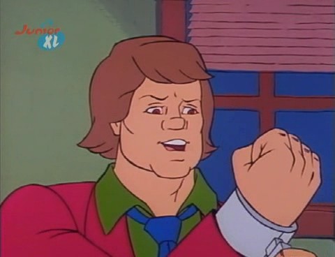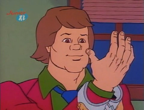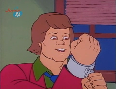 Mutig oder dumm: Tracy hat die neuen Geisterschellen erfunden, und Eddie muß sie gleich ungefragt ausprobieren. Es passiert, was passieren muß: Er kriegt sie nicht mehr ab. Dazu kann ich nur sagen: Selber schuld! Auf die Frage nach einem Schlüssel gibt sich Tracy verschämt. Ob Tracy allerdings wirklich vergessen hat, einen Schlüssel zu den Schellen zu erfinden, oder ob das gar nicht angedacht war, lasse ich mal dahingestellt…