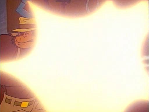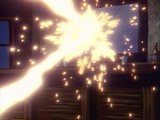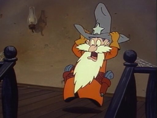 Ursache: Sheriff Stumbleweed duckt sich unter dem Dematerialisator in Eddies Händen, um sich zu schützen. Dadurch trifft Eddie zwei Spiegel und zerschießt sich den Dematerialisator dadurch selbst.