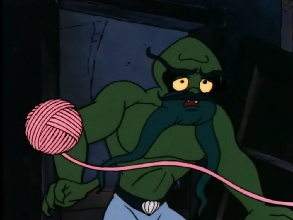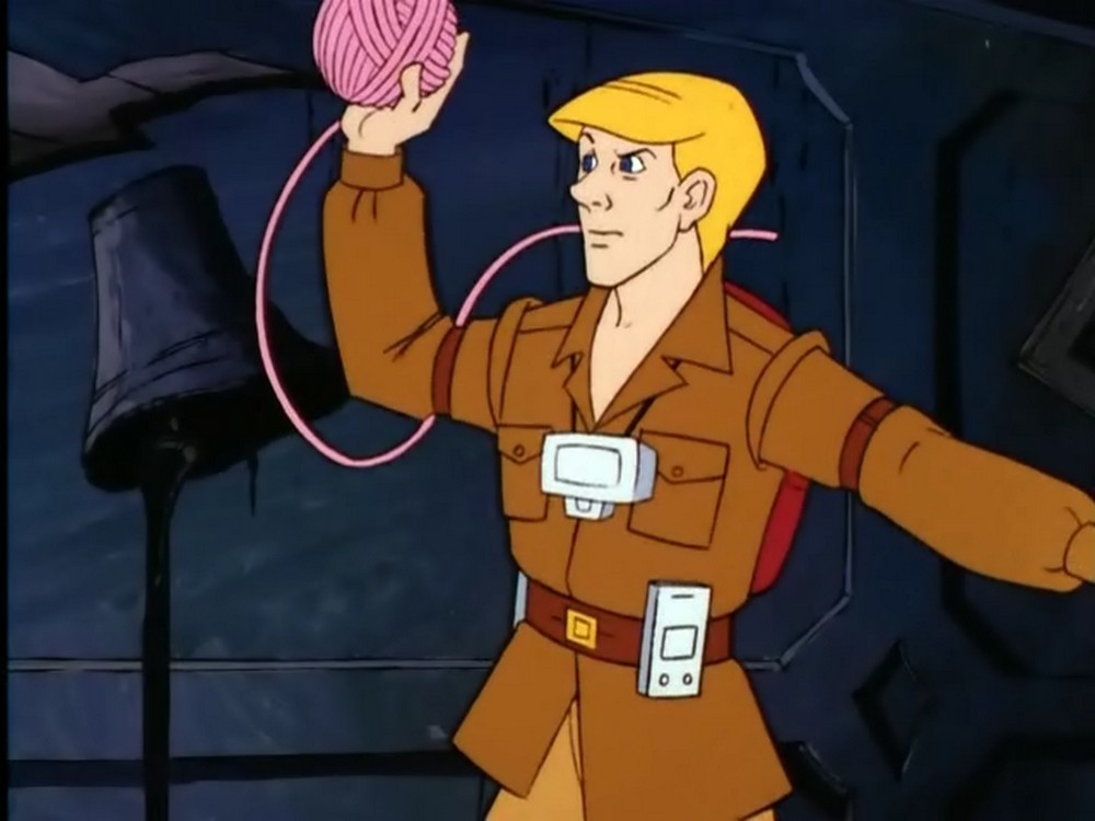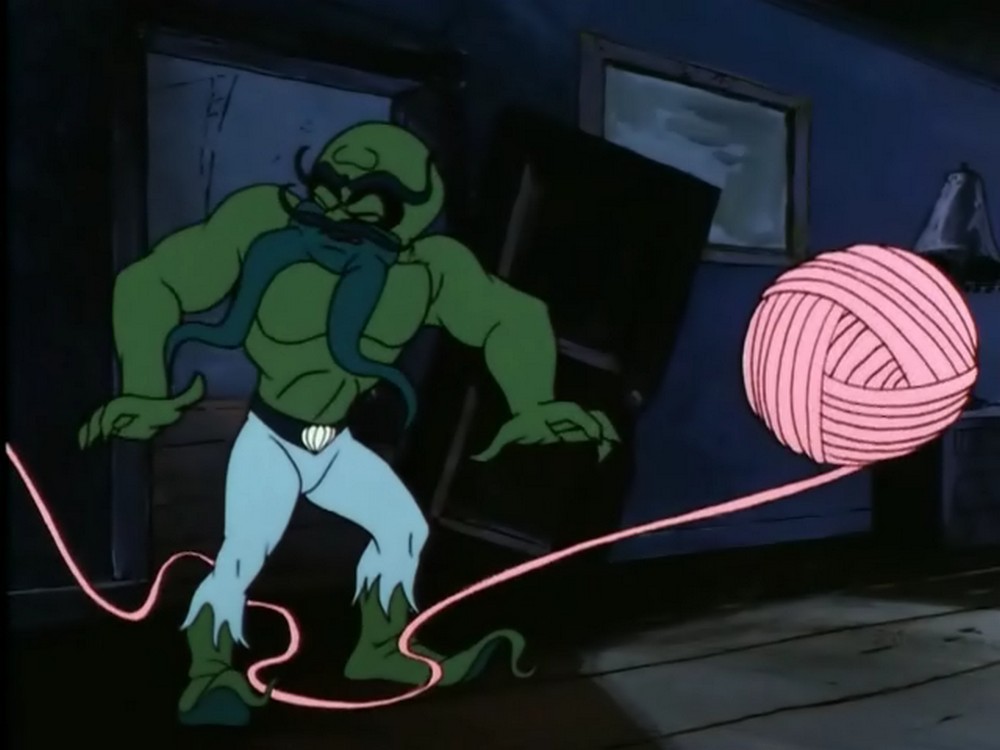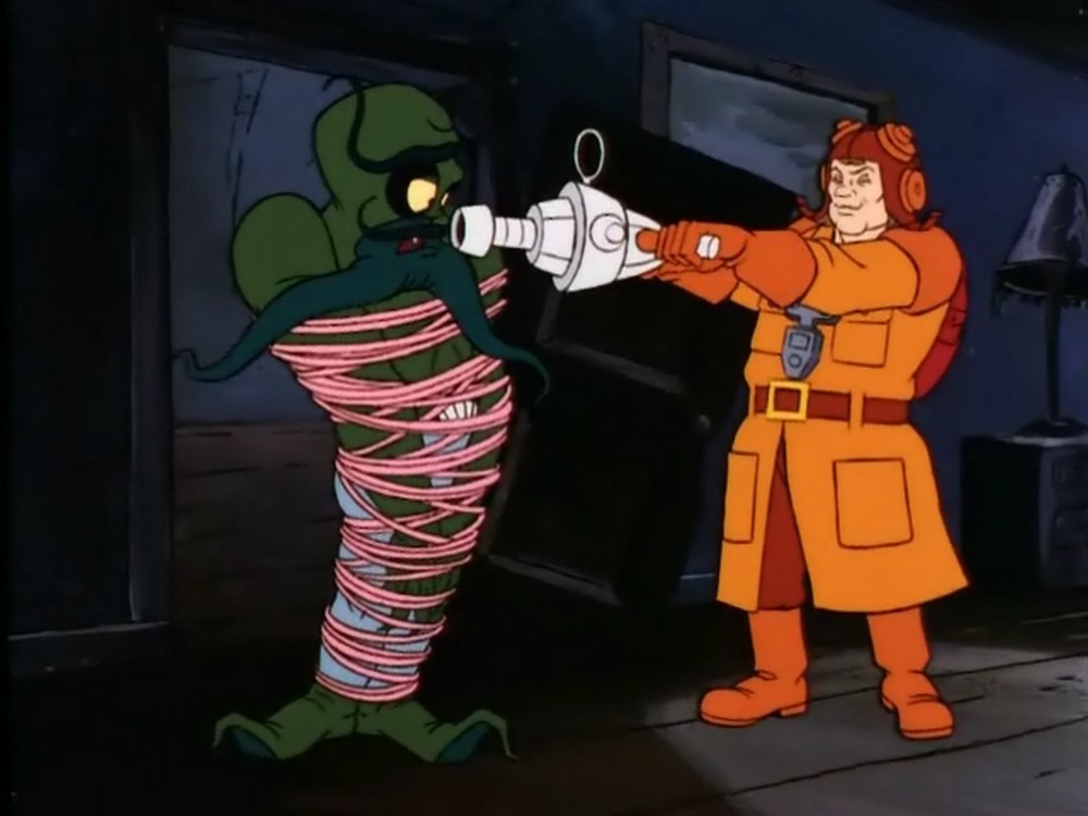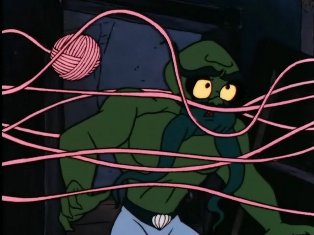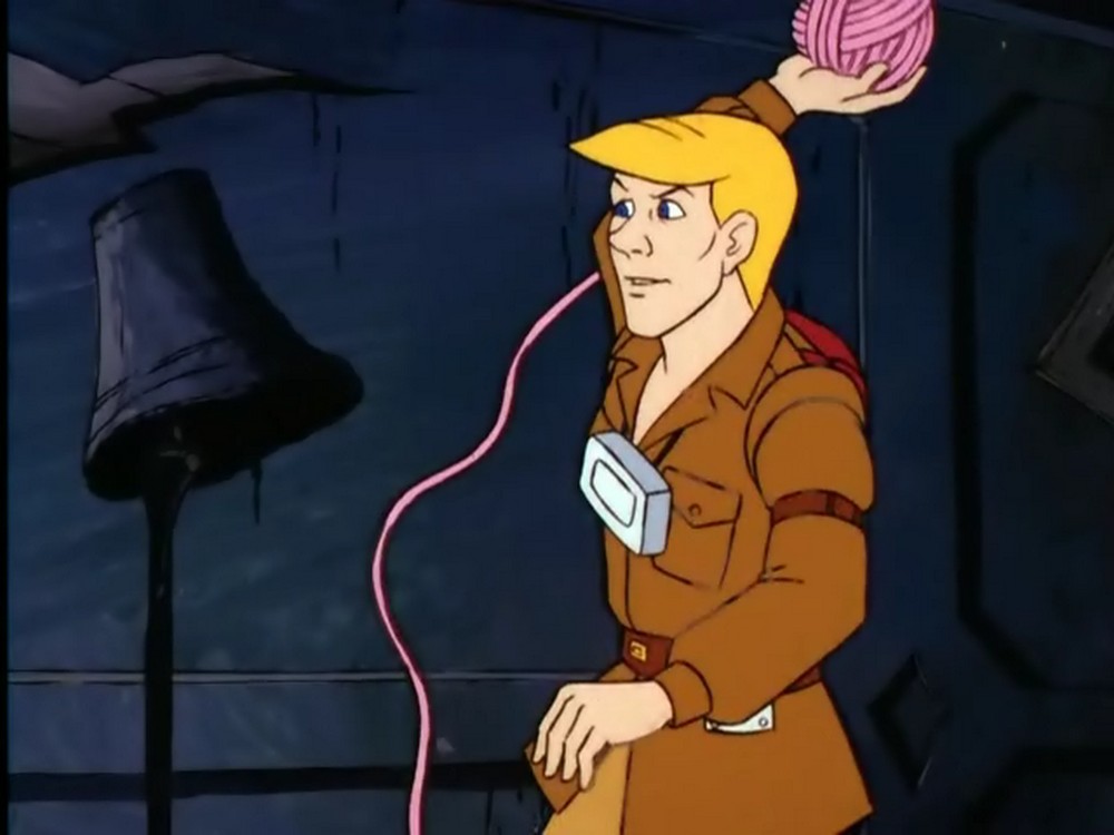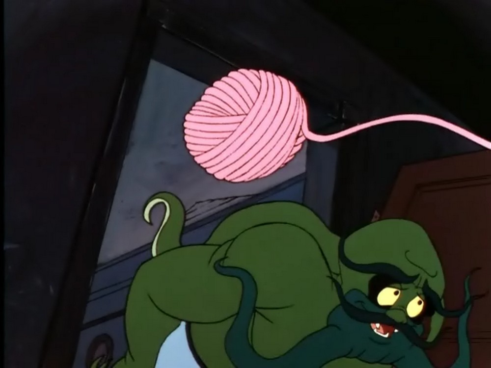 Zumindest nehme ich an, daß es sich hier um eine spezielle Garnrolle zum Geisterfangen handelt. Eventuell funktioniert sie ähnlich wie Ghostgum – der Farbe und der gummihaften Dynamik nach zu urteilen. Hier setzt Jake die Garnrolle erfolgreich gegen Mister Squit ein: