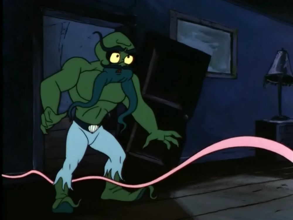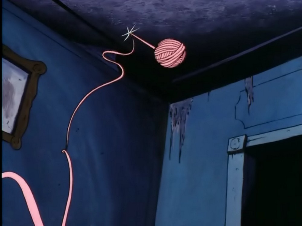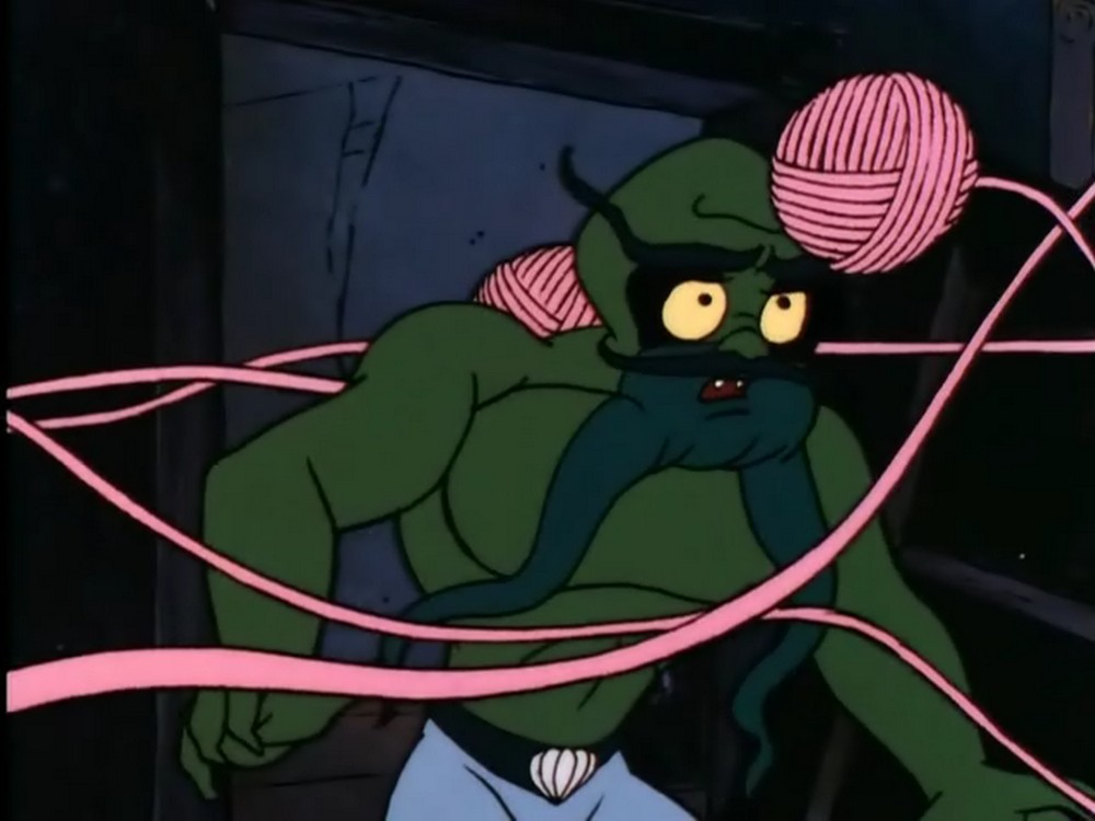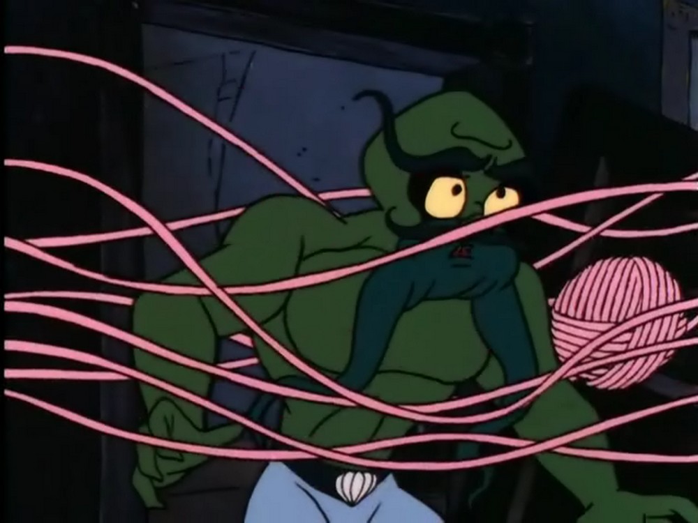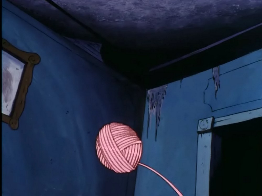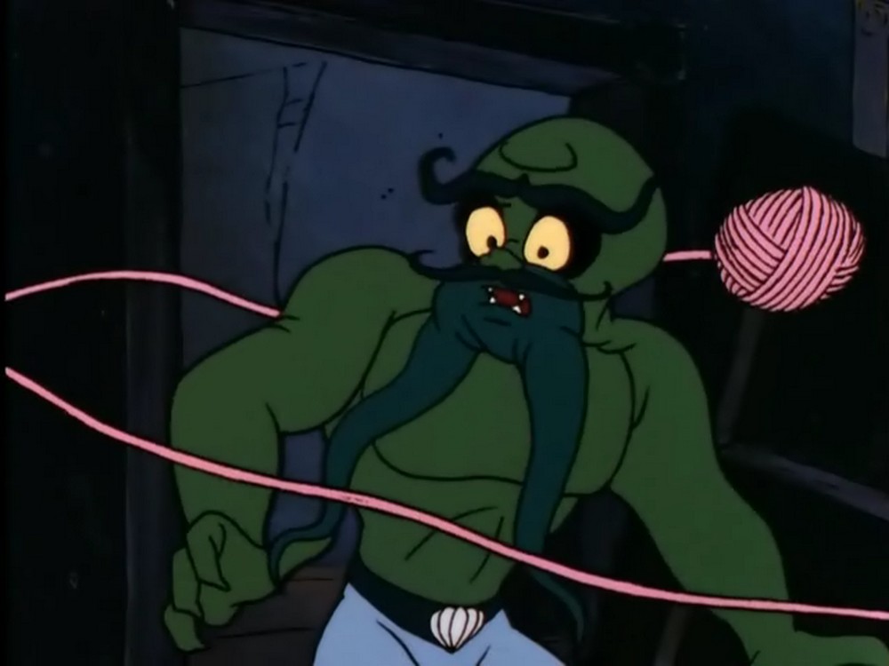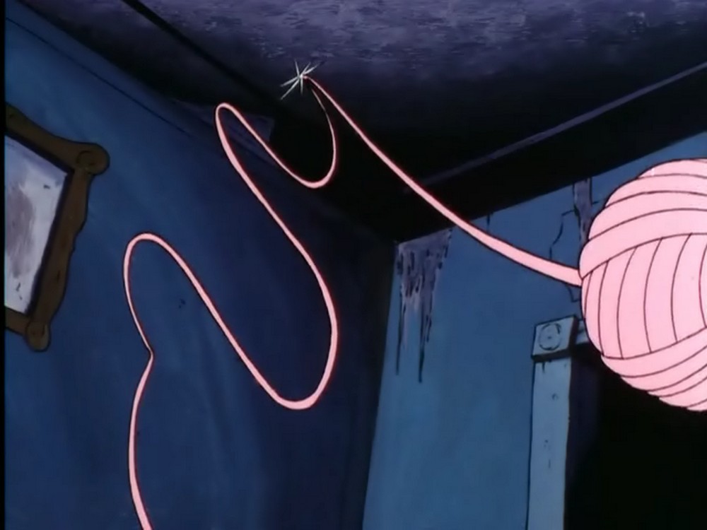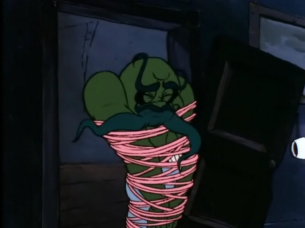 Zumindest nehme ich an, daß es sich hier um eine spezielle Garnrolle zum Geisterfangen handelt. Eventuell funktioniert sie ähnlich wie Ghostgum – der Farbe und der gummihaften Dynamik nach zu urteilen. Hier setzt Jake die Garnrolle erfolgreich gegen Mister Squit ein: