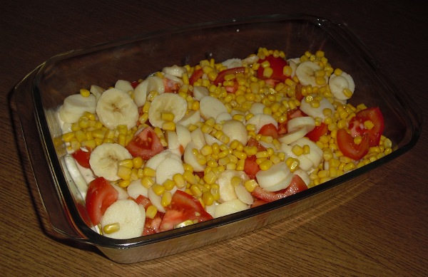 Auf der Gratinsauce folgt nun als erstes eine Schicht aus Kartoffeln, Bananen, Tomaten und Mais.