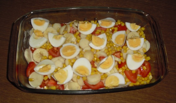 Die hartgekochten Eier werden ebenfalls in vier Teile zerteilt und als zweite Lage auf dem Auflauf verteilt.