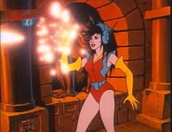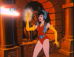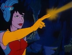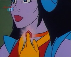 Mit den Augen kann sie magische Elemente beeinflussen. Auf diese Weise aktivierte sie das Amulett von Milarka wieder.