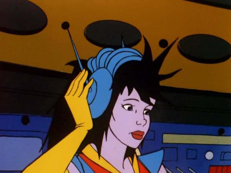 Mit ihrem Headset kann sie Nachrichten empfangen. Es dient also auch als Kommunikationseinheit.