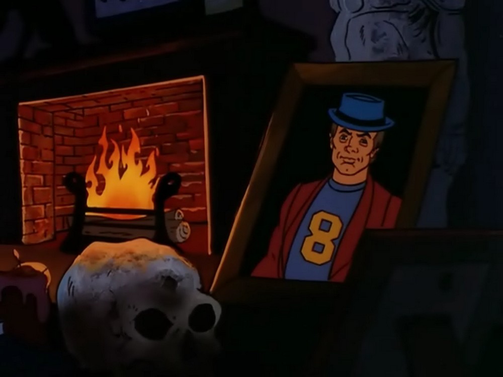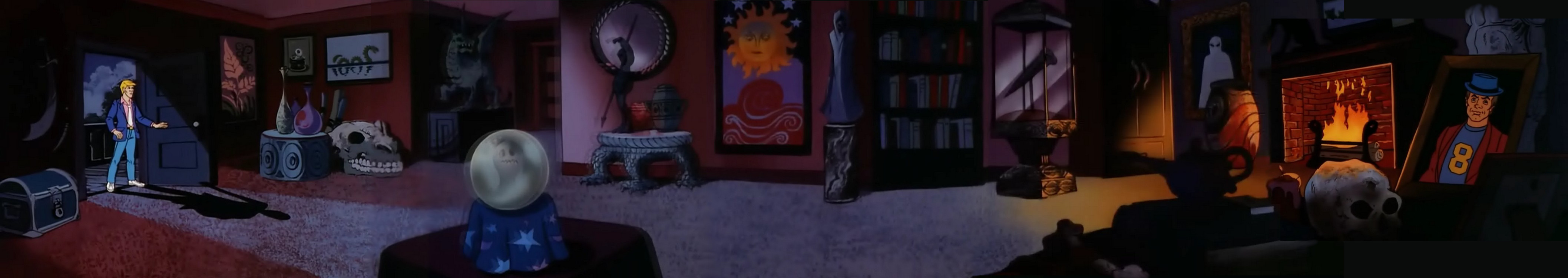 Man findet hier zum Beispiel direkt neben der Eingangstür eine Truhe, einen Schädel von einem recht großen Tier und ein Bild von Nessie. In einer Nische, die zu einem anderen Raum des Hauses oder einer Treppe führen mag, steht eine große Statue von einem geflügelten Tier. Weiter im Raum steht ein Tischchen mit einer Kristallkugel, sowie neben einem großen Bild mit Sonne und Sternen ein Tischchen mit Klauenfüßen, auf dem unter anderem eine Skulptur steht. Zur anderen Seite des Bildes findet sich ein gut gefülltes Bücherregal, und daneben eine Vitrine. Daneben im Halbdunkel könnte ein Schrank stehen.