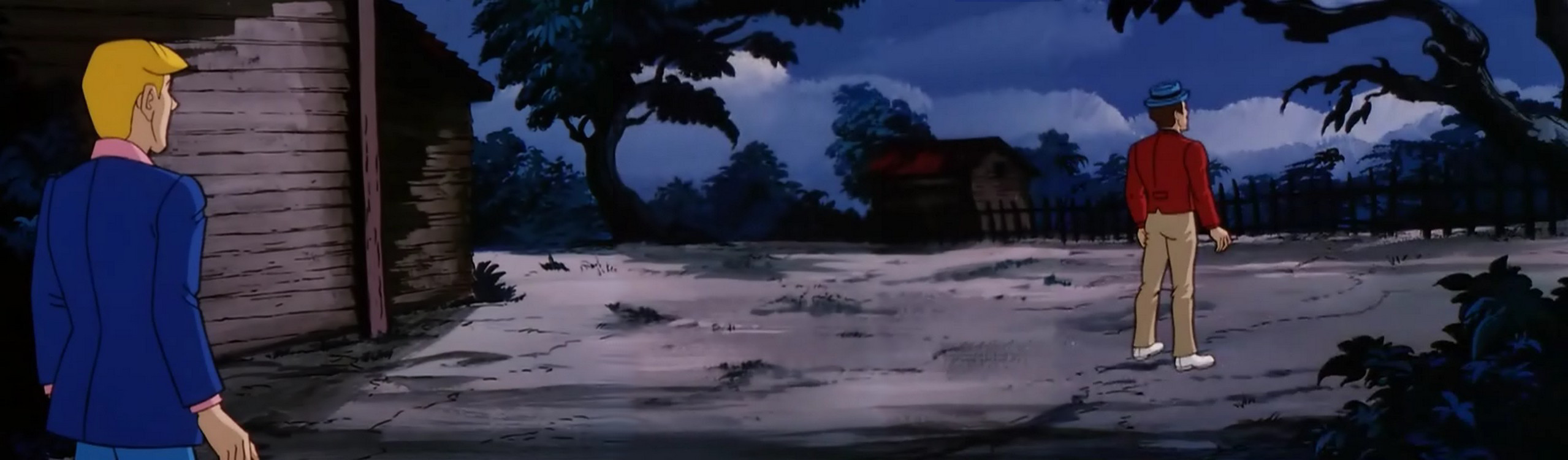 Ein Blick zur hinteren Seite des Hauses hinaus verrät, daß das Haus wirklich recht einsam und ländlich gelegen ist. Man kann noch ein weiteres Haus erkennen. Da ein Zaun davor zu sehen ist, scheint dieses Gebäude nicht mehr zu Kongs Grundstück zu gehören.