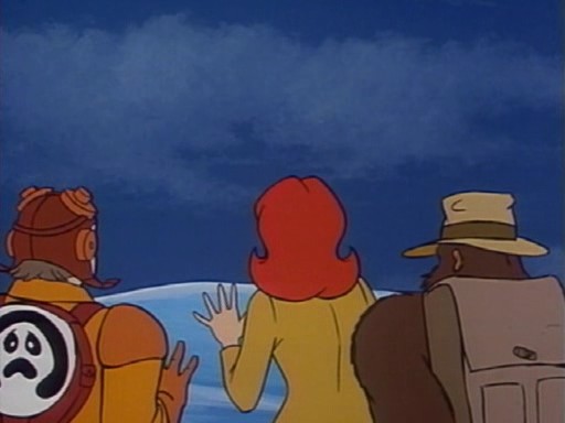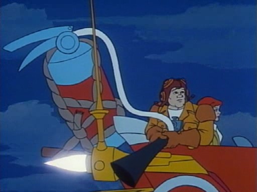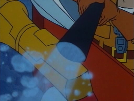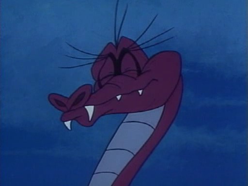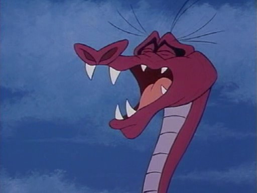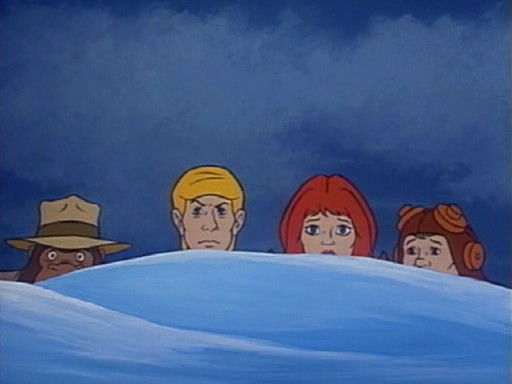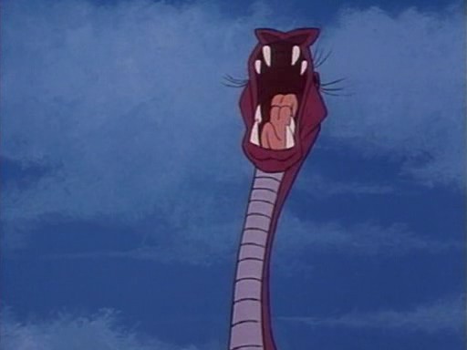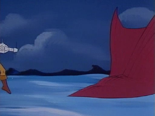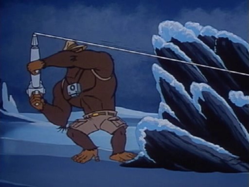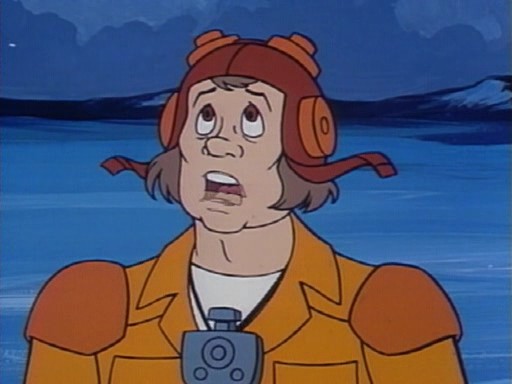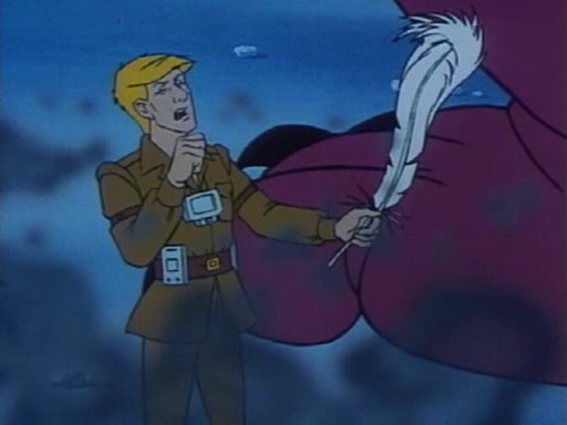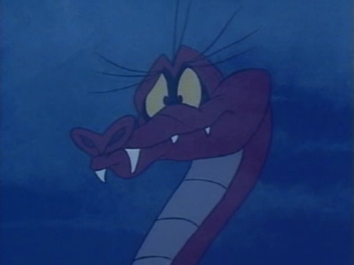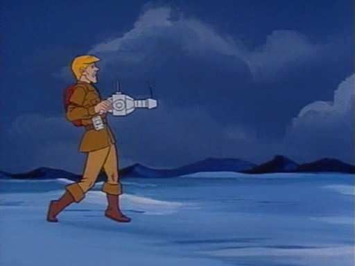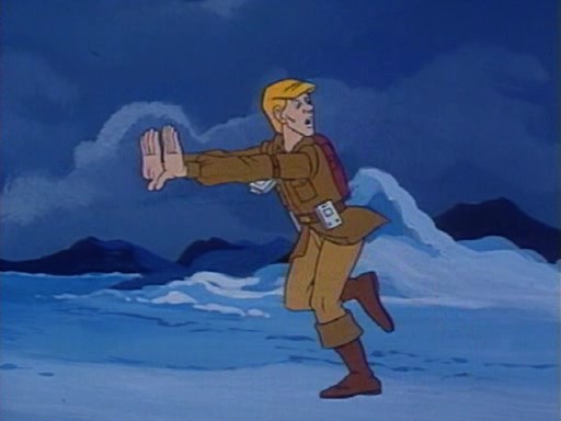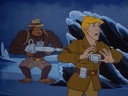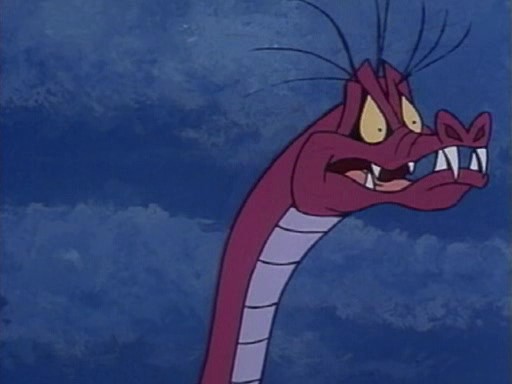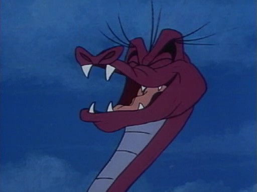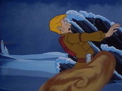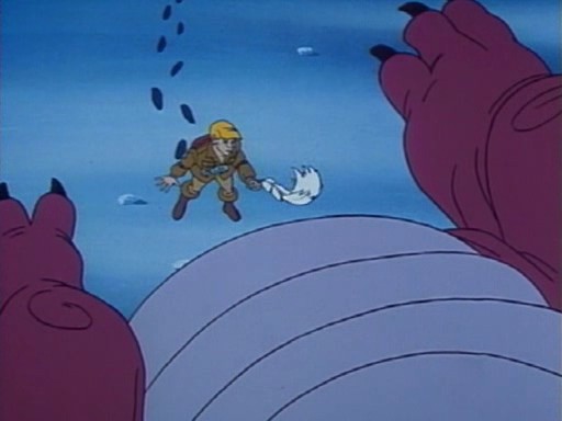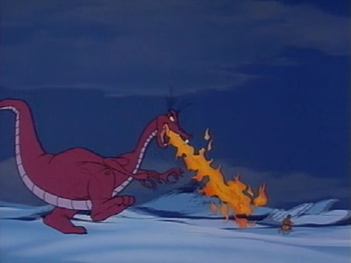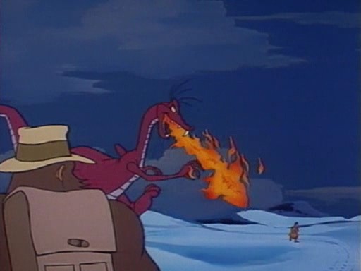 Der erste Versuch, den Drachen zu bekämpfen: Jake geht mutig mit dem Dematerialisator voran. Leider »verfehlt« er den Drachen, muß vor ihm fliehen und verliert dabei auch noch den Dematerialisator. Das ist für den Öldrachen ein gefundenes Fressen – im wahrsten Sinne des Wortes …